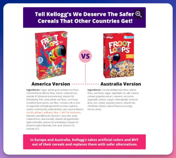 Hari specifically criticized Kellogg's for the ingredients used in its U.S. cereals. She claims many contain dyes and chemicals banned in the European Union, while in Europe and other countries, Kellogg’s uses natural ingredients.